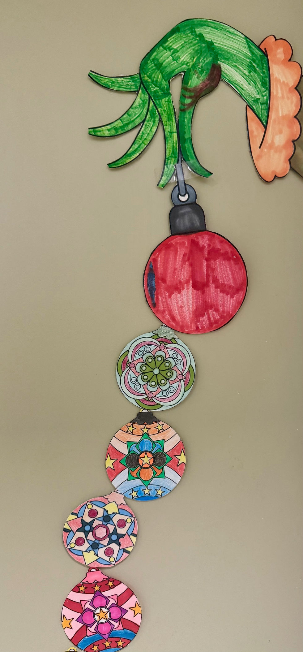 Selbst bei uns in der Schule kommt Grinch, der Weihnachten nicht mag, in Weihnachtsstimmung. Er findet einfärbige Glaskugeln langweilig. Aber unsere edlen, sorgfältig verzierten Glaskugeln hält er in der Hand, ganz vorsichtig, damit sie nicht hinunterfallen. Jede einzelne Kugel ist einfallsreich gestaltet, mit Präzision bemalt. Es sind lauter individuelle Einzelstücke, die gemeinsam eine schöne Kette bilden.